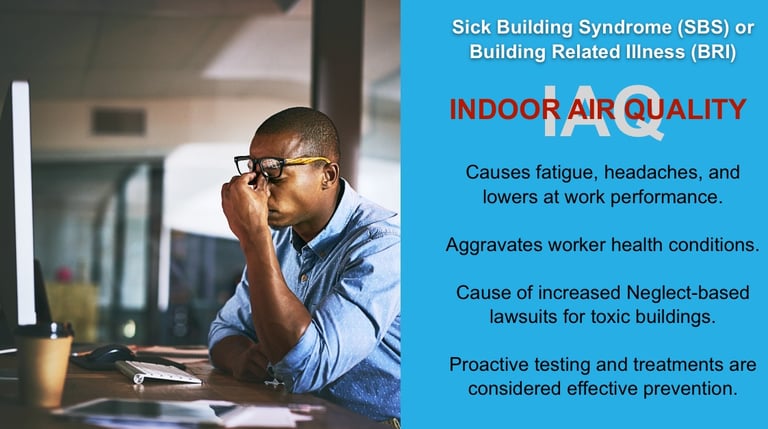 It is reported that roughly 80% of buildings suffer from poor "Indoor Air Quality" (IAQ). This is an invisible threat that often goes untreated for years until a health-related lawsuit or a review reveals the health problems of employees.